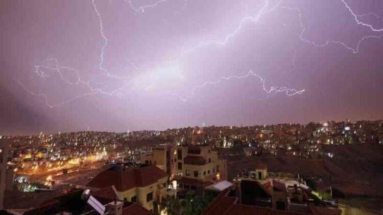 ومع ساعات العصر تعبر الجبهة الهوائية الباردة، حيث تشتد الهطولات المطرية وتكون غزيرة أحياناً في شمال ووسط المملكة والمناطق الجنوبية الغربية، إضافة إلى مناطق الأغوار والبحر الميت، وقد تصحبها العواصف الرعدية وتساقط البَرَد، ما يؤدي إلى تشكل السيول في الأودية والمناطق المنخفضة وارتفاع منسوب المياه.