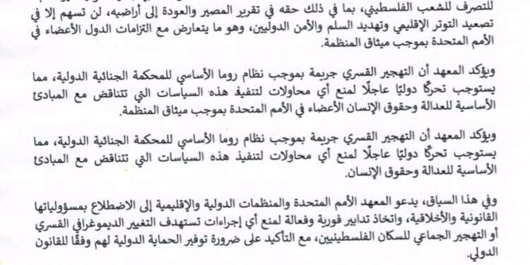 ويؤكد المعهد أن التهجير القسري جريمة بموجب نظام روما الأساسي للمحكمة الجنائية الدولية، مما يستوجب تحركًا دوليًا عاجلًا لمنع أي محاولات لتنفيذ هذه السياسات التي تتناقض مع المبادئ الأساسية للعدالة وحقوق الإنسان الأعضاء في الأمم المتحدة بموجب ميثاق المنظمة.