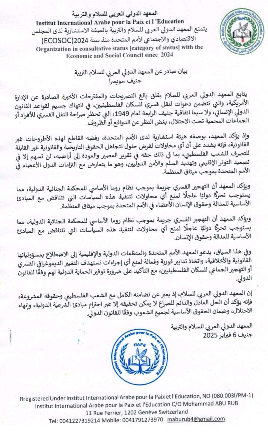 بيان صادر عن المعهد الدولي العربي للسلام
