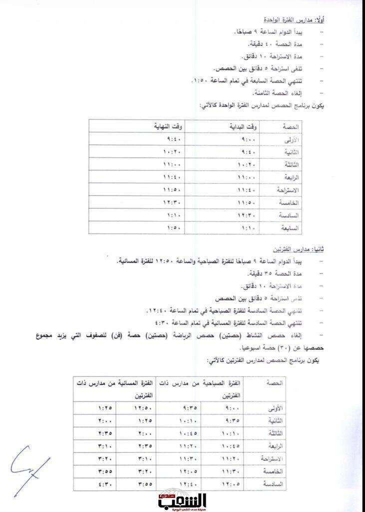 وأوضحت الوزارة أن الدوام في مدارس الفترتين سيبدأ الساعة التاسعة صباحًا للفترة الصباحية والساعة (12:50) للفترة المسائية، وأن مدة الحصة الصفية في مدارس الفترتين سيكون (35) دقيقة، ومدة الاستراحة 10 دقائق، وإلغاء استراحة 5 دقائق بين الحصص، وبحيث تنتهي الحصة السادسة للفترة المسائية في تمام الساعة (4:30)،