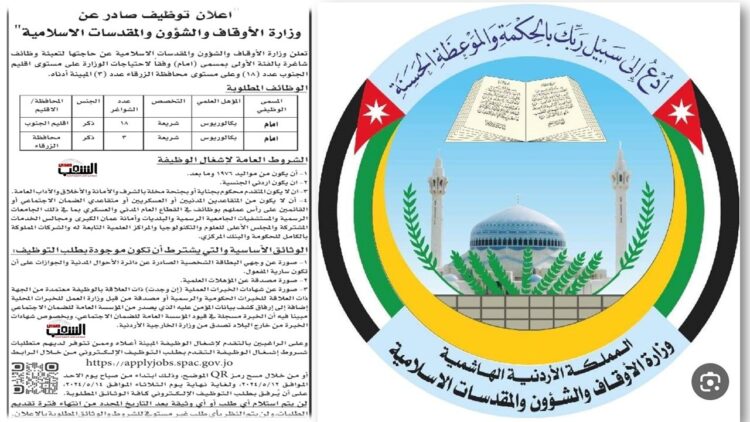 أعلنت وزارة الأوقاف و الشؤون المقدسات الإسلامية عن حاجتها لتعبئة وظائف شاغرة في الفئة الأولى بمسمى إمام وفقاً لاحتياجات الوزارة على مستوى إقليمي “الجنوب و العدد المطلوب 18 إماماً و على مستوى محافظة الزرقاء و المطلوب إمامين,