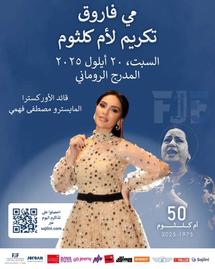 صدى الشعب – تعلن جمعية أصدقاء مهرجانات الأردن، بالتعاون مع هيئة تنشيط السياحة الأردنية، عن إقامة أمسية غنائية استثنائية بعنوان “تكريم أم كلثوم”، تحييها النجمة المصرية مي فاروق، وذلك يوم السبت 20 أيلول 2025 على المدرج الروماني في قلب العاصمة عمّان.