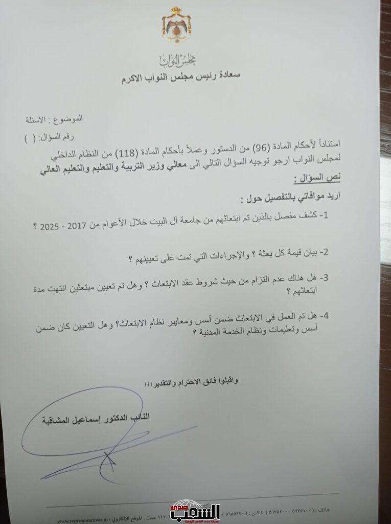 النائب المشاقبة يوجه سؤالاً نيابياً للحكومة حول بعثات جامعة آل البيت وتعيينات المُبتعثين .. وثيقة