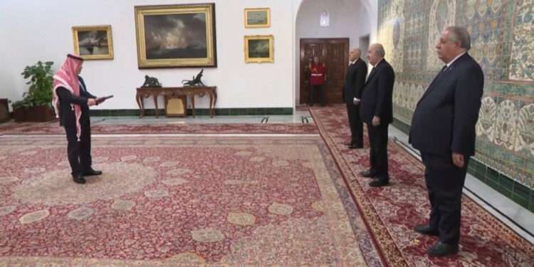 صدى الشعب – قدّم السفير عاهد علي سويدات، الأحد، أوراق اعتماده إلى الرئيس عبدالمجيد تبون رئيس الجمهورية الجزائرية الديمقراطية الشعبية، سفيراً مفوّضاً وفوق العادة معتمداً ومقيماً للمملكة الأردنية الهاشمية لدى الجزائر، خلال مراسم جرت في مقر رئاسة الجمهورية.