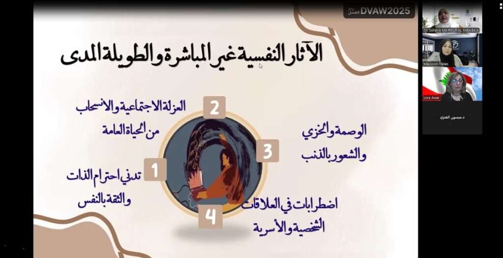 • الدكتورة سناء الحسين السبايبة التي عرضت التأثيرات النفسية والاجتماعية للعنف الإلكتروني، وأكّدت ضرورة توفير خدمات الدعم النفسي المتخصص للمتضررات واستراتيجيات الوقاية من العنف الرقمي ومواجهته .