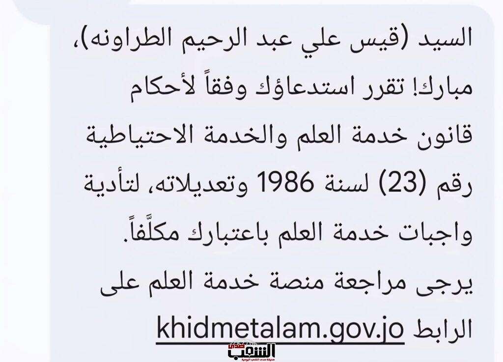 صدى الشعب – أعلن الإعلامي الأردني علي الطراونة، عبر صفحته الرسمية، استدعاء نجله قيس لخدمة العلم بعد إجراء القرعة اليوم الإثنين و تالياً ما كتبه الطراونة: