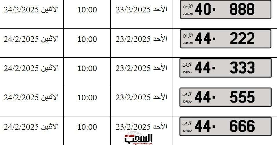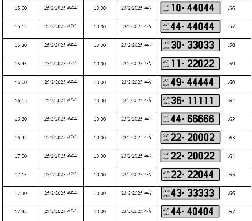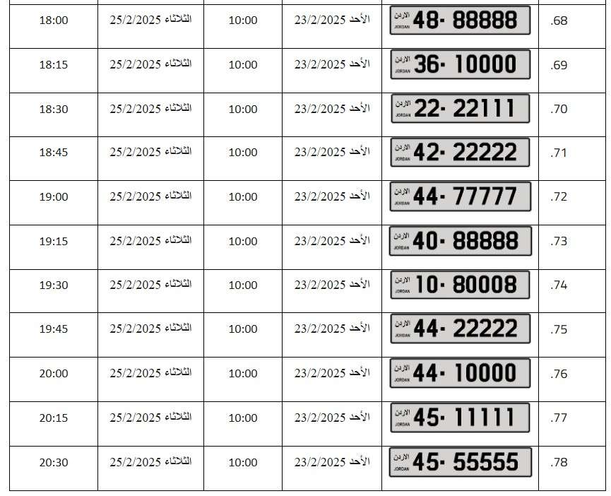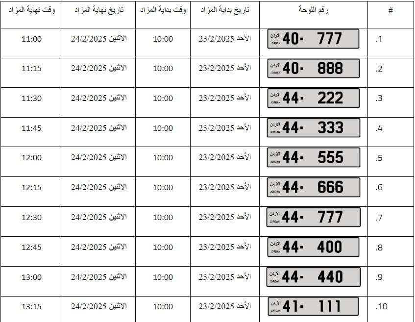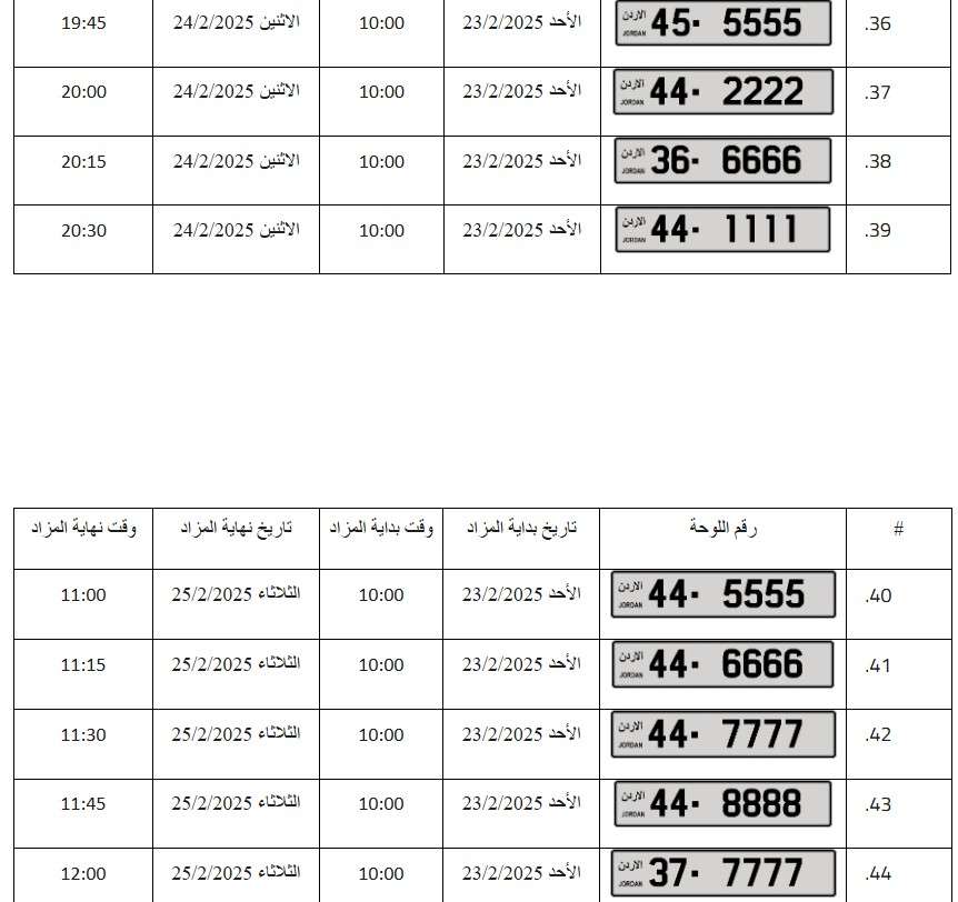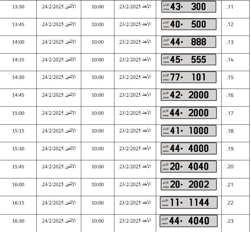 – يبدأ المزاد العلني الالكتروني على جميع الأرقام اعتباراً من يوم الأحد الموافق 23/2/2025م وينتهي المزاد على بعض الأرقام يوم الاثنين الموافق 24/2/2025م وعلى باقي الأرقام يوم الثلاثاء الموافق 25/2/2025م حسب الأوقات المبينة إزاء كل رقم .