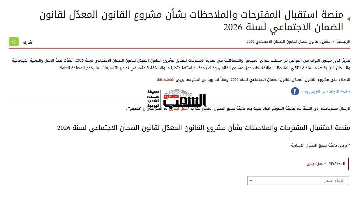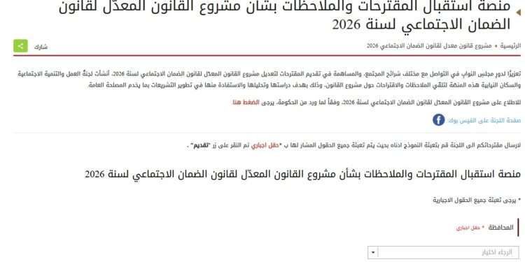 صدى الشعب – أطلق مجلس النواب منصة إلكترونية أطلق عليها (المال مالك و الرأي رأيك) مخصصة لاستقبال المقترحات والملاحظات من المواطنين والخبراء والمهتمين، بشأن مشروع القانون المعدل لـ قانون الضمان الاجتماعي الأردني لسنة 2026، وذلك في إطار تعزيز مبدأ التشاركية وإشراك الرأي العام في مناقشة التشريعات ذات الأثر الاقتصادي والاجتماعي.