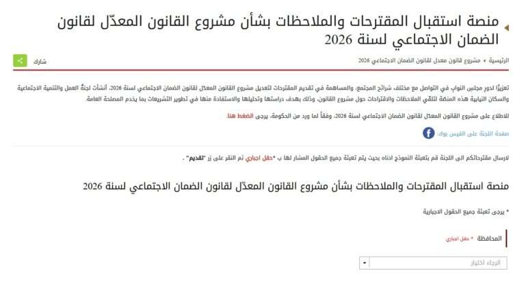 وتهدف المنصة إلى إتاحة المجال أمام مختلف فئات المجتمع لتقديم آرائهم ومقترحاتهم حول بنود مشروع القانون، بما يسهم في إثراء النقاشات التي تجريها اللجان النيابية المختصة قبل إقراره بصيغته النهائية.