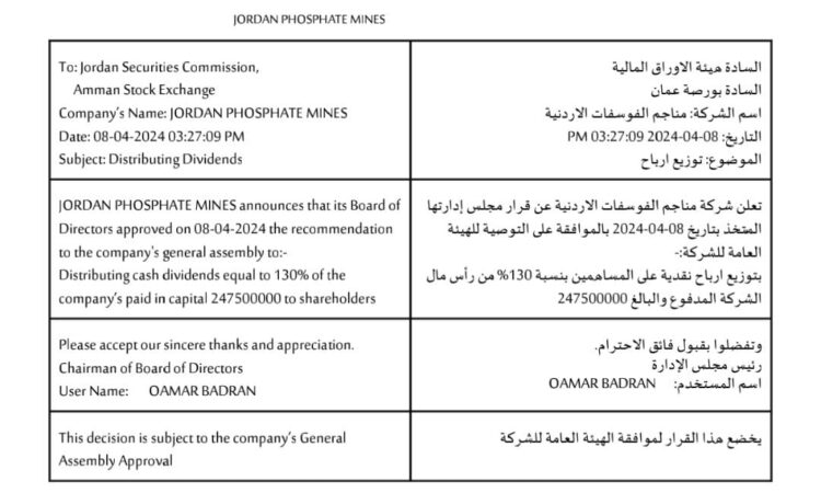 صدى الشعب – أعلنت شركة مناجم الفوسفات الأردنية عبر إفصاح لها على هيئة الأوراق المالية وبورصة عمان، عن قرار مجلس إدارتها، اليوم الاثنين، بالموافقة على التوصية للهيئة العامة للشركة بتوزيع أرباح نقدية على المساهمين بنسبة 130 بالمئة من رأس مال الشركة المدفوع والبالغ 247.5 مليون دينار، على أن يخضع هذا القرار لموافقة الهيئة العامة للشركة.