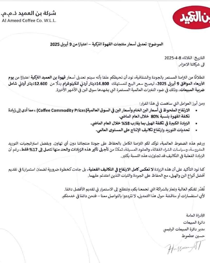 صدى الشعب – أعلنت شركة بن العميد، الرائدة في صناعة وتوزيع القهوة في الأردن، عن تعديل أسعار منتجات القهوة التركية وفق بيان تم تداوله في مواقع التواصل، منوهاً بـ(يدخل القرار حيّز التنفيذ ابتداءً من يوم الأربعاء 9 نيسان 2025).