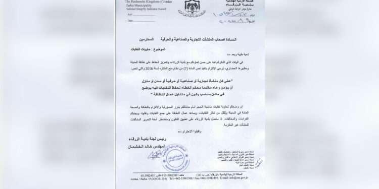 وجاء في الرسالة التي وقعها رئيس لجنة بلدية الزرقاء المهندس خالد الخشمان، أنه يتوجب على كل منشأة أن تؤمن وعاءً ملائماً ومحكماً الغطاء لحفظ النفايات، ويوضع في مكان مناسب يكون في متناول عمال النظافة، وذلك وفقاً لنص المادة (7) من نظام منع المكاره لسنة 2016.