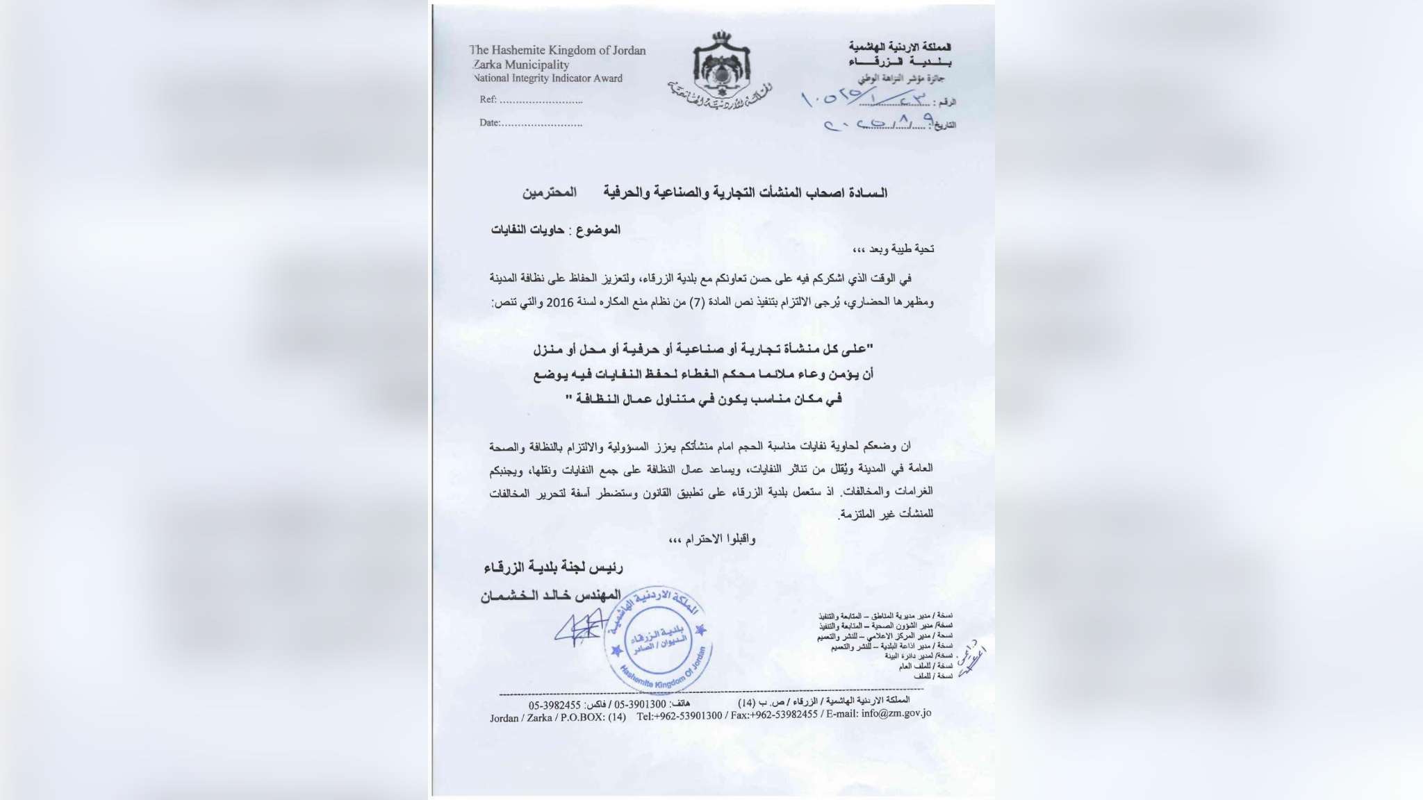 وجاء في الرسالة التي وقعها رئيس لجنة بلدية الزرقاء المهندس خالد الخشمان، أنه يتوجب على كل منشأة أن تؤمن وعاءً ملائماً ومحكماً الغطاء لحفظ النفايات، ويوضع في مكان مناسب يكون في متناول عمال النظافة، وذلك وفقاً لنص المادة (7) من نظام منع المكاره لسنة 2016.