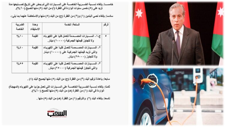 وبحسب النظام فإن السيارات المُصممة التي تعمل كليا على الكهرباء والتي لا تتجاوز قيمتها على 10 آلاف دينار نسبة الضريبة الخاصة 10%، والتي تتجاوز 10 آلاف ولا تتجاوز 25 الف أصبحت الضريبة الخاصة 40%، بينما السيارات الكهربائية التي تتجاوز قيمتها 25 ألف دينار أصبحت الضريبة الخاصة عليها 55%.