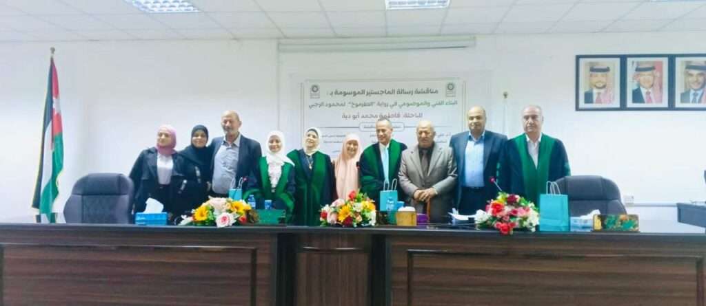 صدى الشعب – نُوقشت في كلية الآداب قسم اللغة العربية وآدابها فِي جامعة جرش رسالة الماجستير المقدّمة من الباحثة فاطمة محمد أبو دية بعنوان “البناء الفني والموضوعي في رواية “الطرموخ” لمحمود الرجبي”.