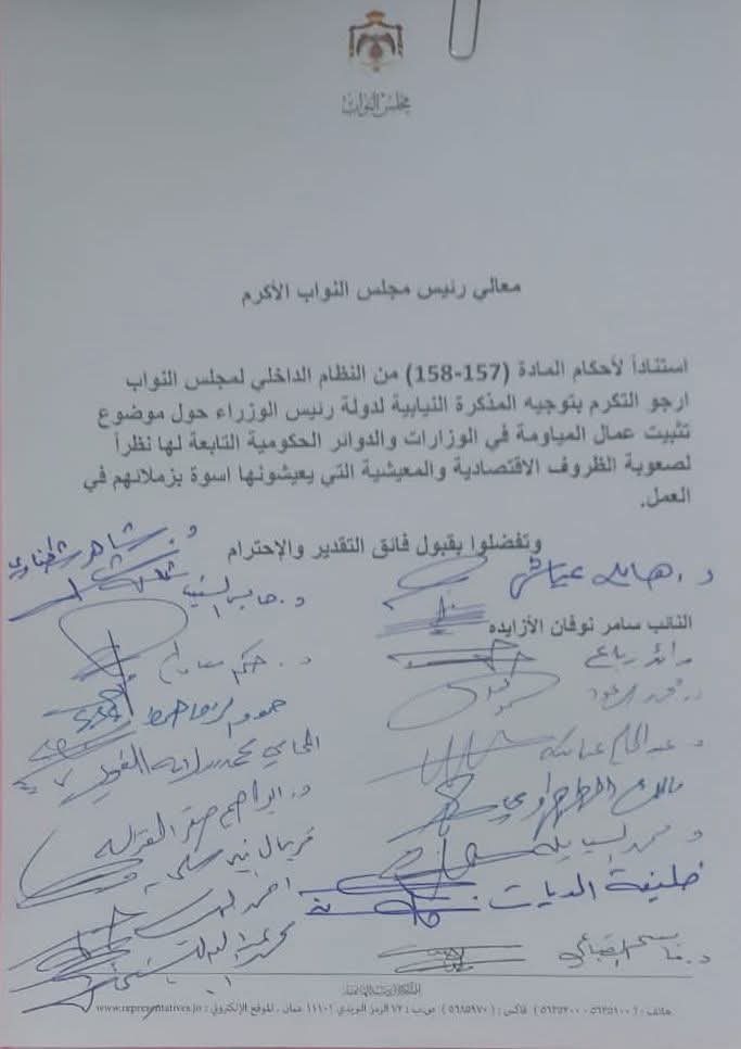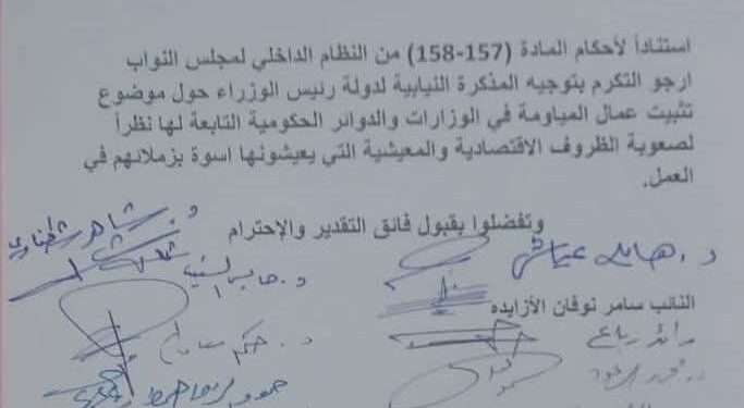 رفع عدد من أعضاء مجلس النواب مذكرة رسمية لرئيس المجلس طالبوا فيها الحكومة باتخاذ قرار فوري بتثبيت عمال المياومة في الوزارات والدوائر الحكومية.