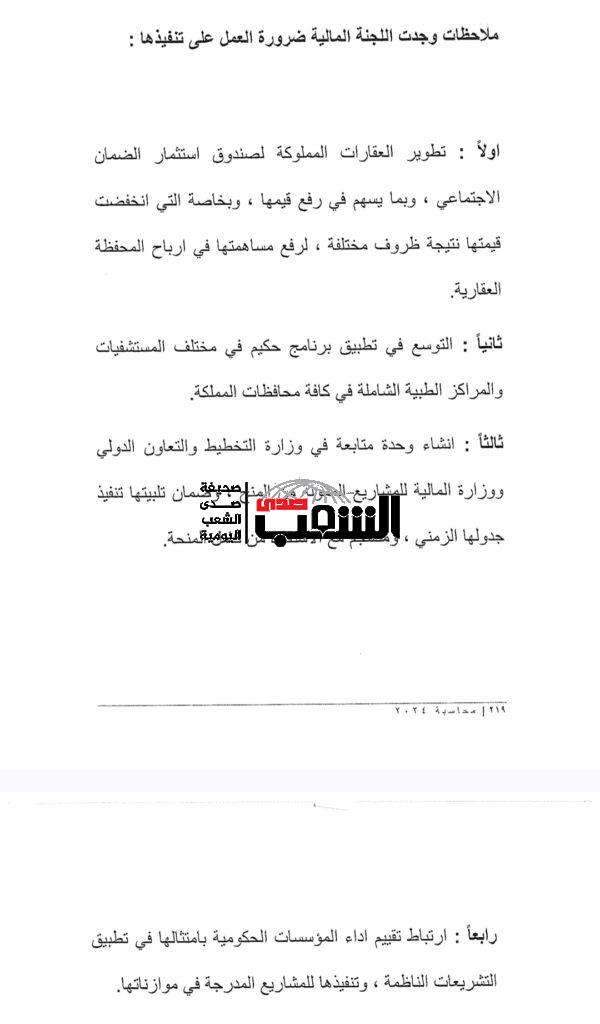 سيستعرض رئيس اللجنة المالية، الدكتور نمر السليحات ما خلصت إليه اللجنة خلال اجتماعاتها الِ36 و سيتحدث عن 60 مخرج رقابي تم تصويبه و 13 مخرج رقابي تم اتخاذ قرار إحالته لهيئة النزاهة و مكافحة الفساد في مختلف الوزارات و المؤسسات أما المخرجات الرقابية التي تم اتخاذ قرار التحصيل فيها، فعددها 41، فيما المخرجات الرقابية التي تم اتخاذ قرار الاسترداد فيها فهي 45.