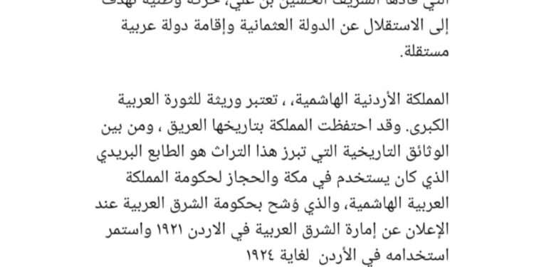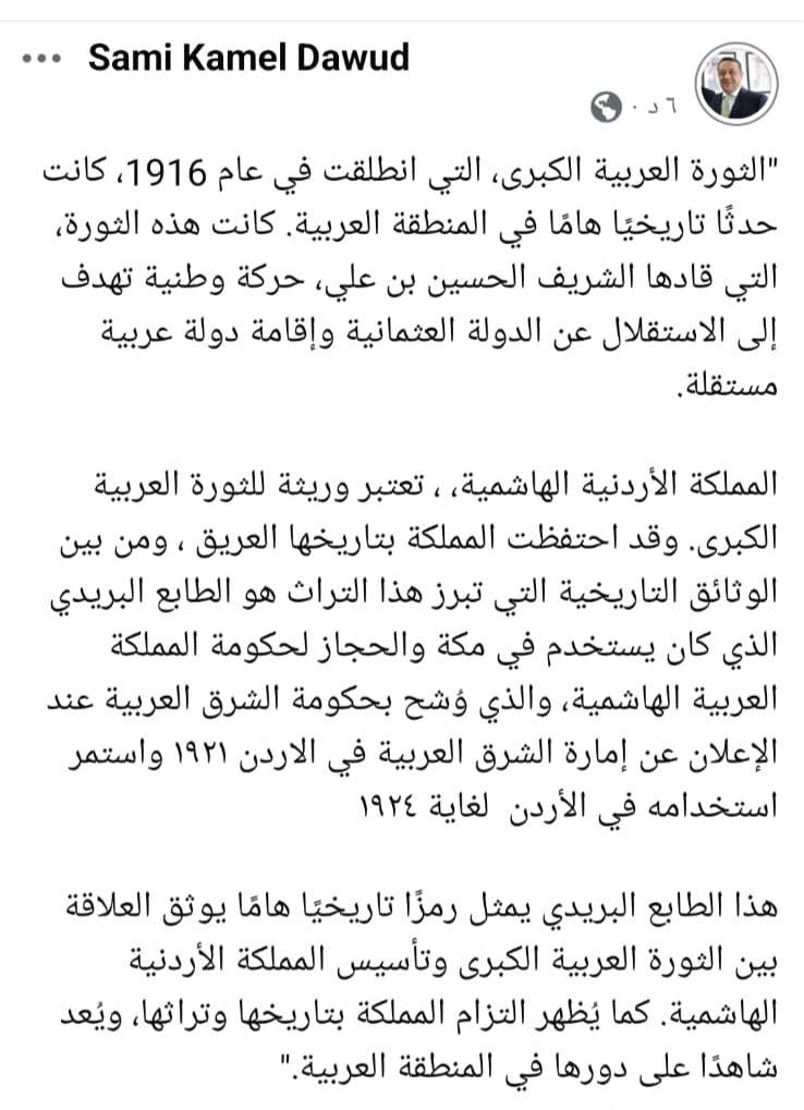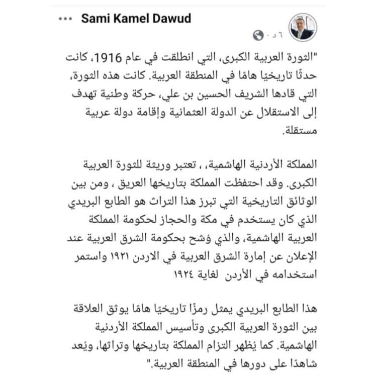 صدى الشعب – نشر رئيس مجلس إدارة البريد الأردني سامي كامل الداوود عبر صفحتة على الفيس بوك طابعا بريدياً تاريخياً كان يستخدم في مكة والحجاز لحكومة المملكة العربية الهاشمية، والذي وُشح بحكومة الشرق العربية عند الإعلان عن إمارة الشرق العربية في الاردن ١٩٢١ واستمر استخدامه في الأردن لغاية ١٩٢٤