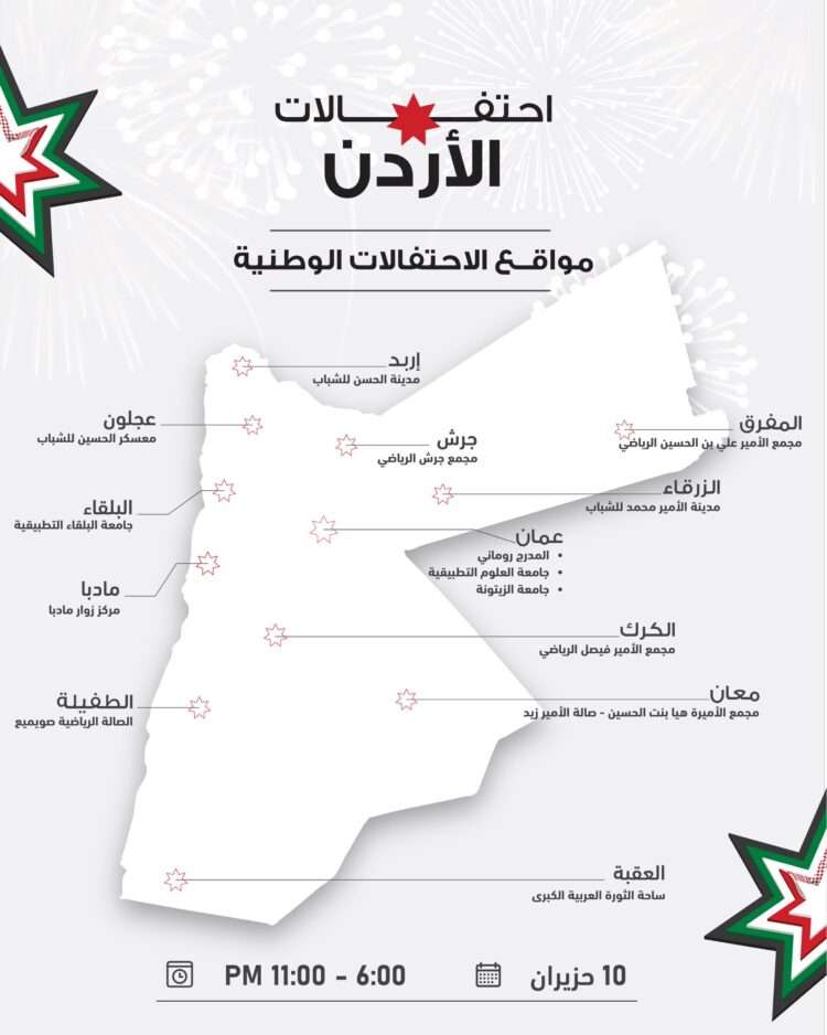 وتنطلق الفعاليات بداية من الساعة السادسة مساءً في العاصمة عمّان، وتحديدًا في منطقة المدرج الروماني، وجامعتي العلوم التطبيقية والزيتونة، وفي مدينة الحسن للشباب في إربد، وفي مجمع جرش الرياضي في جرش، وفي معسكر الحسين للشباب في عجلون، ومجمع الأمير علي بن الحسين الرياضي في المفرق، ومدينة الأمير محمد للشباب في الزرقاء، وفي جامعة البلقاء التطبيقية في البلقاء.
