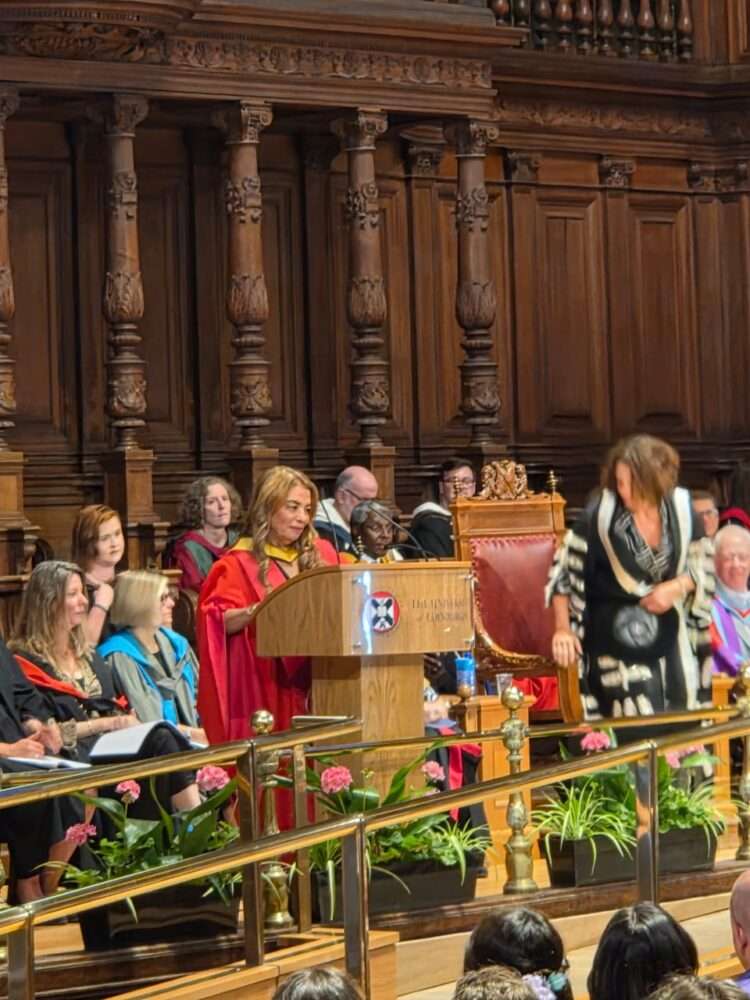 وتابعت: ما زلت أتذكر نصيحة والدي: “عليكِ أن ترفعي رأسك دائمًا”، وذلك بالحفاظ على الكرامة والنزاهة واحترام الذات في أفعالك. أبي، لقد عشت وفقًا لقيمك، ونتيجة لذلك، يشرفني الآن الوقوف هنا اليوم في جامعة إدنبره، محاطةً بهذا المجتمع الرائع من المتعلمين والقادة.