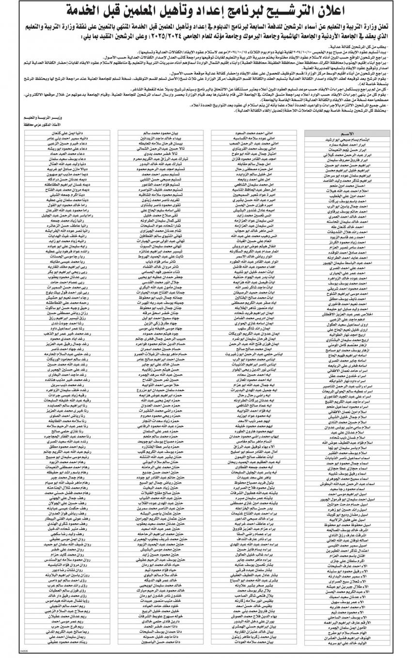 صدى الشعب – أعلنت وزارة التربية والتعليم اليوم الخميس، عن المرشحين للدفعة السابعة لبرنامج الدبلوم في إعداد وتأهيل المعلمين قبل الخدمة المنتهي بالتعيين على نفقة وزارة التربية والتعليم الذي يعقد في الجامعة الأردنية والجامعة الهاشمية وجامعة اليرموك وجامعة مؤتة للعام الجامعي 2024 – 2025.