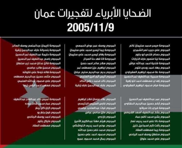 اللواء الركن المتقاعد عبدالله الحسنات، قال:”نستذكر الأحداث الأليمة التي شهدها الأردن يوم الأربعاء في 9 تشرين الثاني 2005، والمعروف بالأربعاء الأسود، حيث تبنى تنظيم القاعدة تلك الهجمات الإرهابية التي استهدفت عدداً من الفنادق في عمان، فتلك الفترة كانت محفوفة بمحاولات عديدة من العمليات الإرهابية من قبل التنظيمات الإرهابية”.