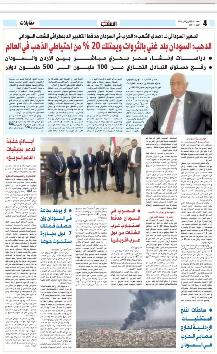 وأشاد السفيرالسوداني لدى المملكة حسن صالح سوار الدهب، بدعم الجهود الاردنية التي يقودها جلالة الملك عبدالله الثاني، والحكومة الأردنية لوقف التصعيد والعدوان على قطاع غزة وكافة الأراضي الفلسطينية المحتلة، ووقوف الأردن المطلق مع الأشقَّاء في لبنان ودعم أمنه واستقراره وسيادته وسلامة وتعزيز الاستقرار والسلام في الإقليم .