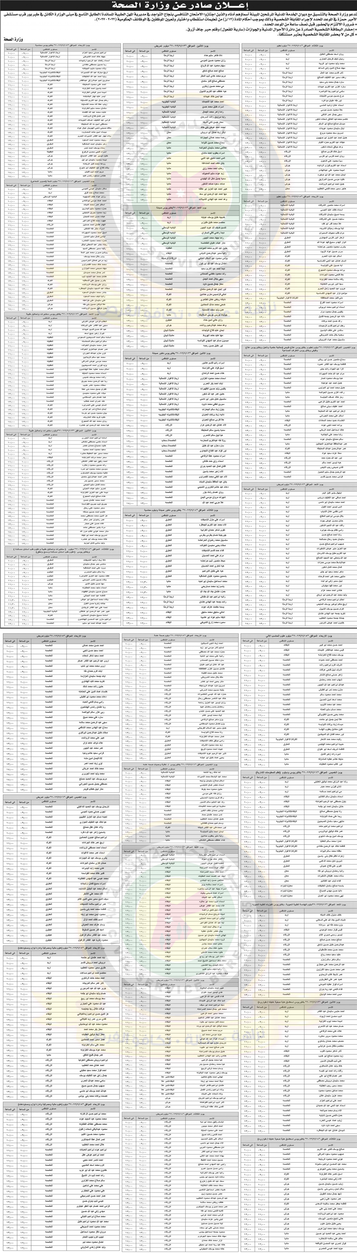صدى الشعب – دعت وزارة الصحة بالتنسيق مع ديوان الخدمة المدنية آلاف الأسماء التالية التي اجتازت الامتحان التنافسي بنجاح التواجد في مبنى الوزارة في الموعد المحدد لإجراء المقابلة الشخصية: