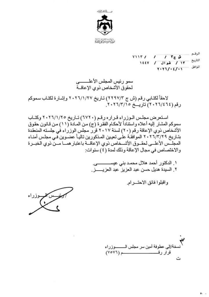صدى الشعب – قرر مجلس الوزراء في جلسته التي عقدها يوم 29 آذار 2026 ، الموافقة على تنسيب رئيس المجلس الأعلى لحقوق الأشخاص ذوي الإعاقة سمو الامير مرعد بن رعد بن زيد، بتعيين الدكتور أحمد هلال بني عيسى وهديل حسن عبدالعزيز عضوين في مجلس أمناء المجلس.