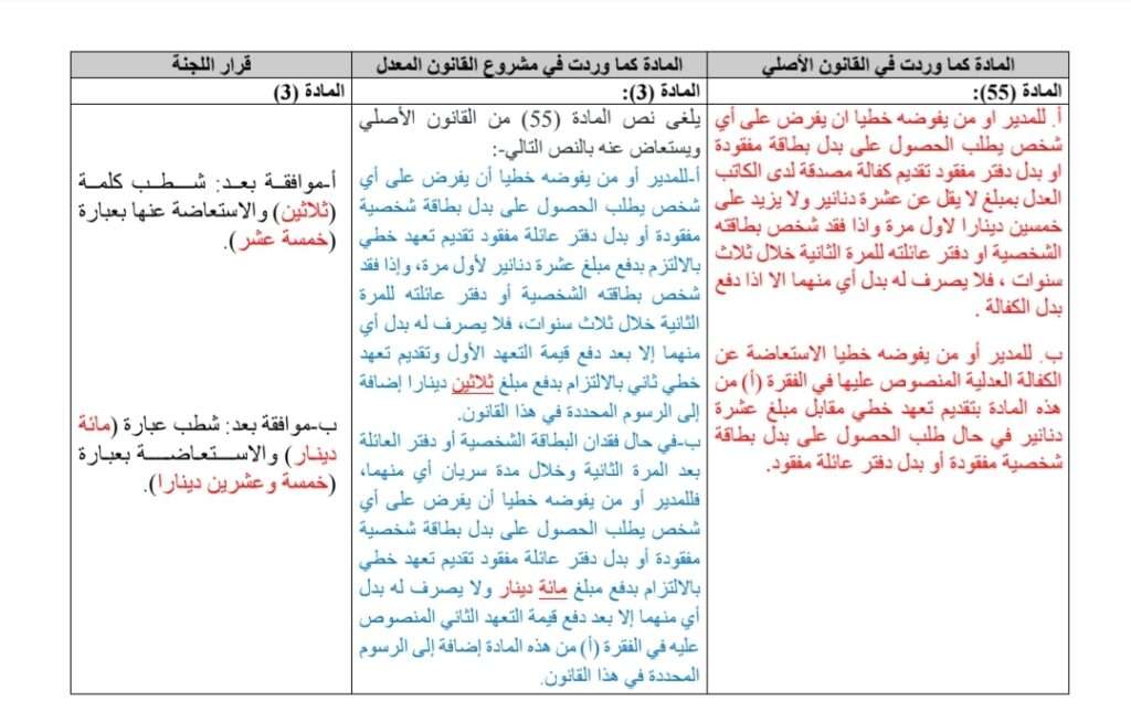 و في نفس المادة 55 – ب (عدلت اللجنة و خفضت غرامة بدل الفاقد للمرة بعد الثانية من 100 دينار لـ25 دينار إضافة إلى الرسوم و الغرامة الواردة في الفقرة (أ) و هي 15 ديناراً.
