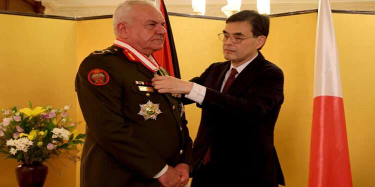 صدى الشعب – تسلم رئيس هيئة الأركان المشتركة اللواء الركن يوسف الحنيطي، الثلاثاء وسام “الشمس المشرقة” الممنوح من قبل إمبراطور اليابان تقديراً لجهوده المتميزة في تعزيز التعاون العسكري بين الأردن واليابان.