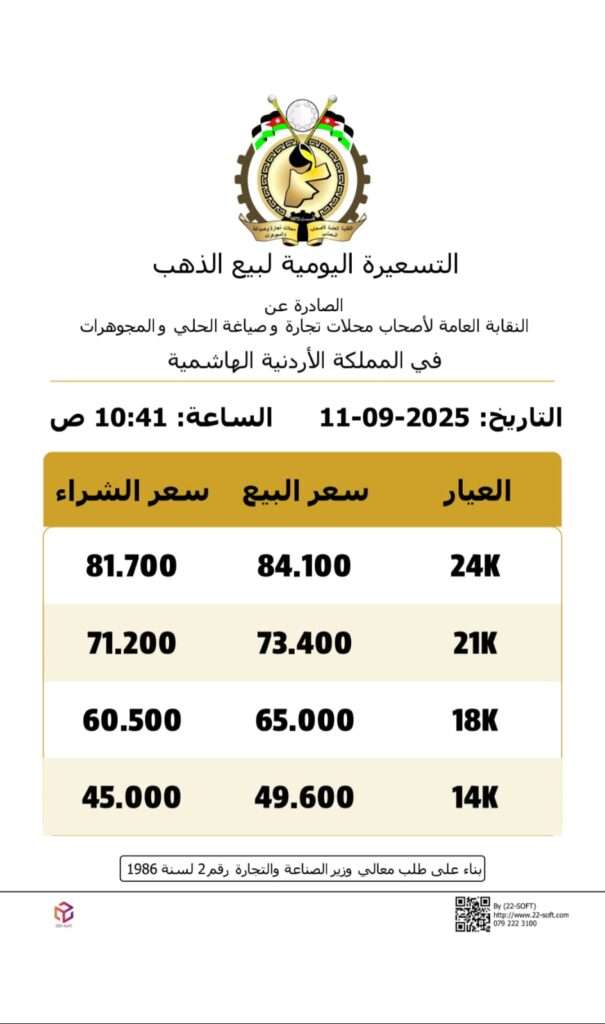 وبلغ سعر بيع الغرام الواحد من الذهب عيارات 24 و18 و14 لغايات الشراء من محلات الصاغة، عند 84.1 و65.و 49.6 ديناراً على التوالي.
