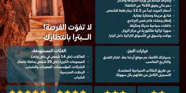 أعلنت وزارة السياحة والآثار عن استهداف فئات جديدة ضمن برنامج “أردننا جنة – البترا”، من خلال إطلاق الرحلات المدرسية والكشفية إلى مدينة البترا بالتعاون مع وزارة التربية والتعليم، وذلك لتعزيز الحركة السياحية الداخلية إلى المدينة الوردية.