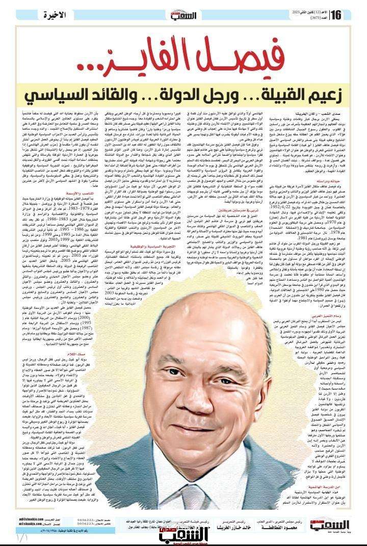 يحظى الاردن برجال كبار وقامات وطنية وسياسية دونت أفعالهم وانجازاتهم العظيمة بأحرف من نور راسخين في القلوب والعقول رسوخ الجبال الشاهقات ومن بين هؤلاء الذي يعجز القلم عن اعطائه حقه يبزغ مشعل شيخ المشايخ وعقيد قبيلة بني صخر والفارس السياسي الأصيل دولة فيصل عاكف الفايز ( أبو غيث) القامة السياسية وشيخ العشيرة المنتمي للعرش والوطن هو عنوان الولاء للهاشميين وعنوان الانتماء للأردن ، هو قصة جوهرية ثمينة .. تحتوي على فصول عدة ، ومواقف مُشرفة .. نبتت أغصان الحُب في قلبه ، وأزهرت في روحه يتنفس حباً ووفاءً وولاء وإنتماء لـ القيادة المُلهمة ، والوطن العظيم .