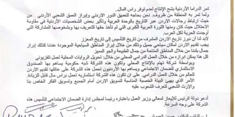 صدى الشعب – طالب النائب الدكتور حسين العموش رئيس الوزراء بتأسيس شركة انتاج فني شبه حكومية وبمساهمة القطاع الخاص في مذكرة قدمها العموش لرئيس الوزراء ووقعها عدد من النواب لشرح الموقف الأردني السياسي درامياً وتسويق الأردن سياحياً وذلك لأهمية إيصال الرسالة السياسية الأردنية للعالم.
