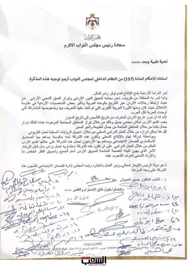 صدى الشعب – طالب النائب الدكتور حسين العموش رئيس الوزراء بتأسيس شركة انتاج فني شبه حكومية وبمساهمة القطاع الخاص في مذكرة قدمها العموش لرئيس الوزراء ووقعها عدد من النواب لشرح الموقف الأردني السياسي درامياً وتسويق الأردن سياحياً وذلك لأهمية إيصال الرسالة السياسية الأردنية للعالم.