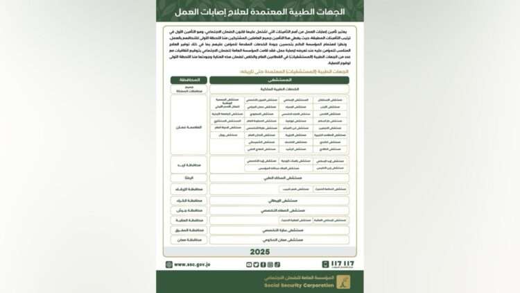 مؤسسة الضمان تنشر قائمة الجهات الطبية المعتمدة للعلاج الفوري لإصابات العمل عبر موقعها الإلكتروني