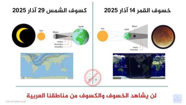 قالت المدربة الفلكية دلال خالد اللالا، من الاتحاد العربي لعلوم الفضاء والفلك أن شهر آذار الحالي سيشهد ظاهرتين فلكيتين مميزتين، وهما خسوف القمر في ١٤ الجاري وكسوف الشمس في ٢٩، حيث ستكونان مرئيتين في بعض دول العالم، لكنهما لن تكونا مشاهدتين في الدول العربية.