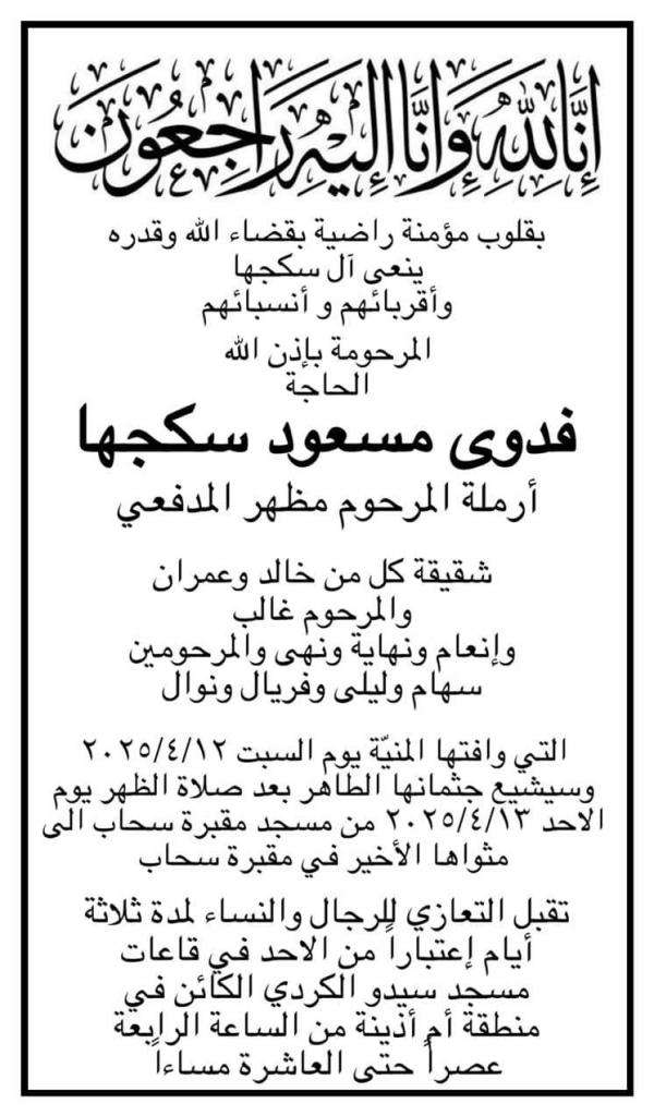 وسيشيع جثمانها الطاهر بعد صلاة الظهر يوم الاحد ٢٠٢٥/٤/١٣ من مسجد مقبرة سحاب الى مثواها الأخير في مقبرة سحاب