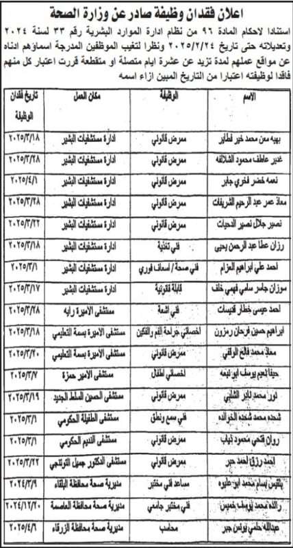 صدى الشعب - أعلنت وزارة الصحة، اليوم الاثنين، عن فقدان موظفين لوظائفهم، وذلك نظراً لتغيبهم عن مواقع عملهم لمدة تزيد عن 10 أيام متصلة أو متقطعة، وتاليا الأسماء: