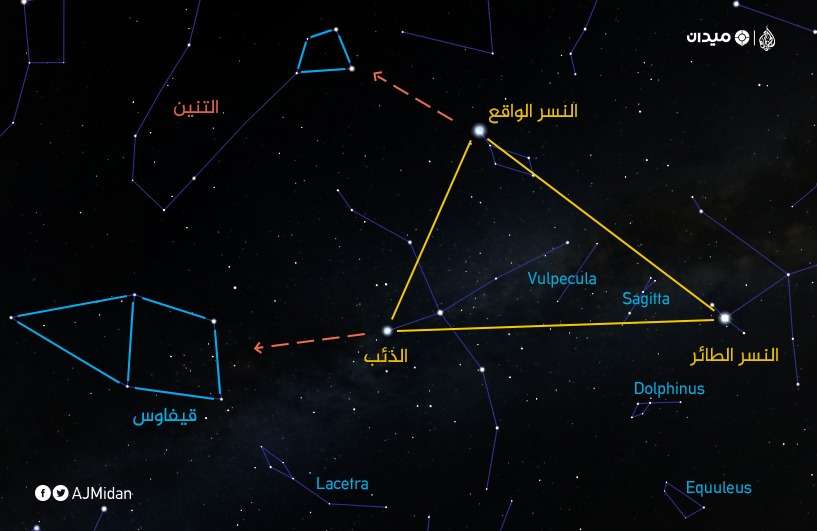 ومن جهة أخرى، يُعد ” مثلث الصيف” بتشكيلاته النجمية المميزة من أشهر ما يظهر في سماء هذا الفصل، ويتكون من ثلاثة نجوم بارزة النسر الواقع في كوكبة القيثارة، النسر الطائر في كوكبة العقاب، وذنب الدجاجة في كوكبة الدجاجة.