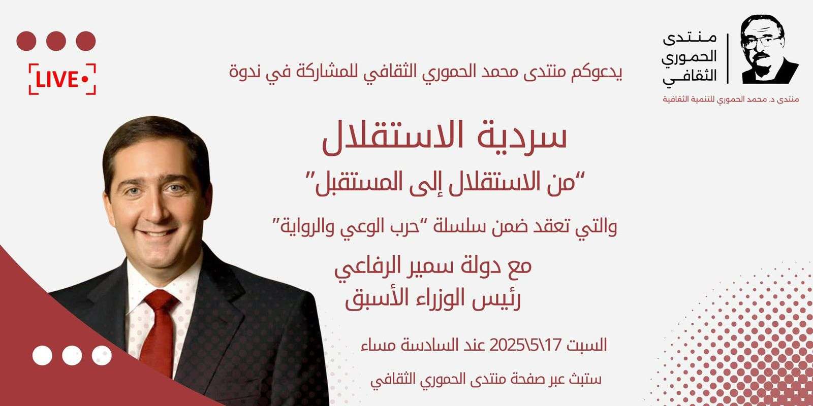 صدى الشعب – يواصل منتدى الدكتور محمد الحموري للتنمية الثقافية سلسلته الفكرية الشهرية “حرب الوعي والرواية”، بندوة جديدة تقام السبت المقبل في عمّان، يستضيف خلالها رئيس الوزراء الأسبق سمير الرفاعي للحديث في ندوة بعنوان: “سردية الاستقلال”.
