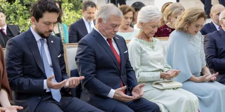 صدى الشعب – بحضور جلالة الملك عبدالله الثاني، وأصحاب السمو الملكي الأمير الحسين بن عبدالله الثاني ولي العهد، والأمير الحسن بن طلال، والأمير هاشم بن عبدالله الثاني، والأمير فيصل بن الحسين، تم عقد قران سمو الأميرة عائشة بنت فيصل بن الحسين على كريم المفتي.