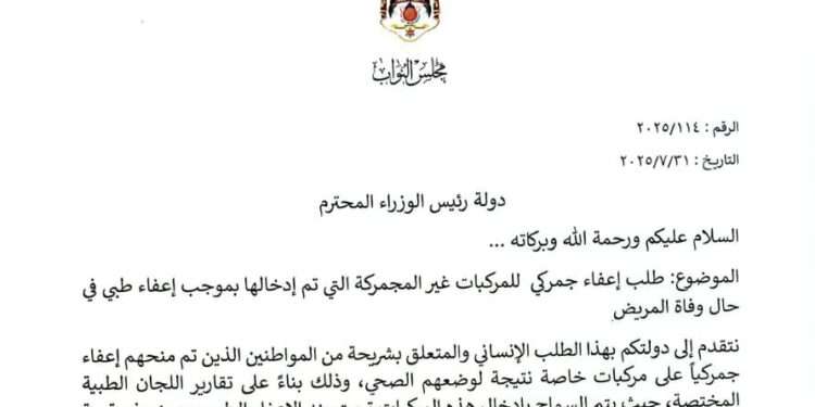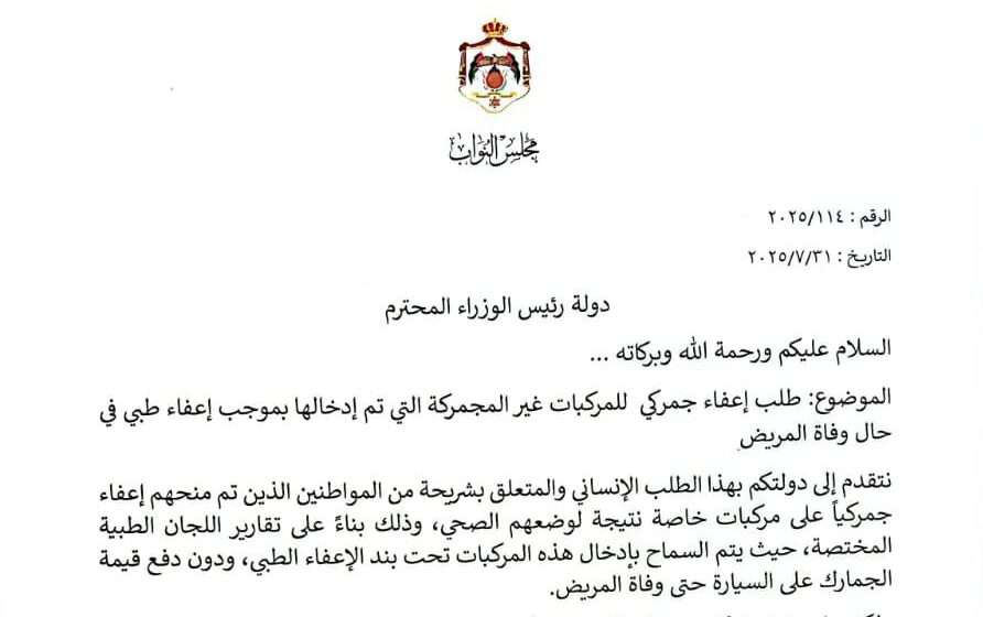 وجه النائبان عن محافظة العقبة حسن الرياطي ولبنى نمور خطابا لرئيس الوزراء طالبا فيه بإعفاء جمركي نهائي للمرضى من ذوي الإعاقة بعد وفاتهم تسهيلا على ذويهم ومراعاة لظروف عائلاتهم