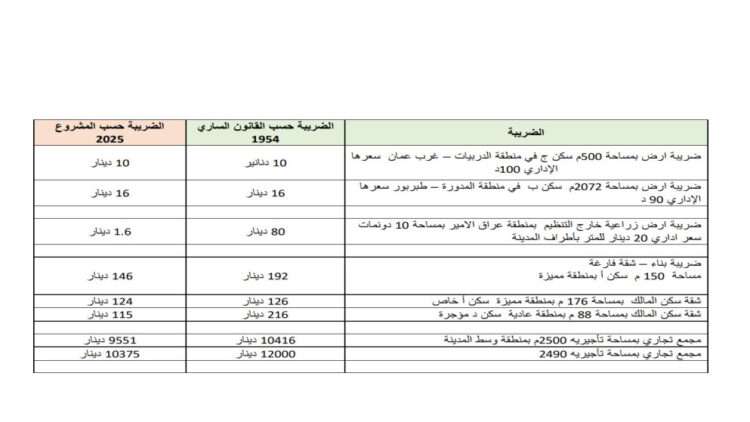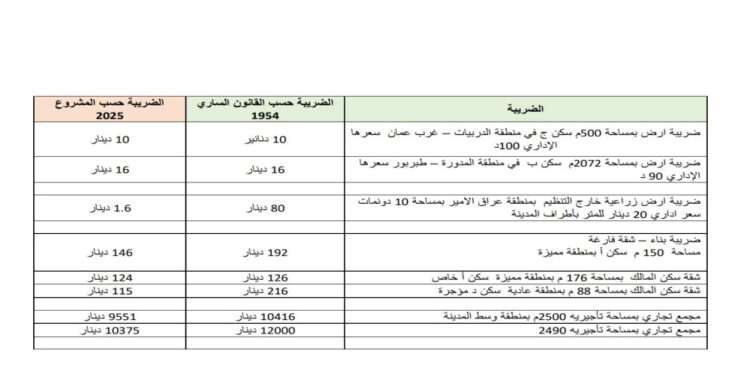 وتصبح الضريبة المفروضة على بناء شقة سكنية فارغة مساحتها 150 مترا مربعا (فئة أ) بمنطقة مميزة، 146 دينارا أردنيا في القانون الجديد، بعد أن كانت 192 دينارا في القانون الساري حاليا.