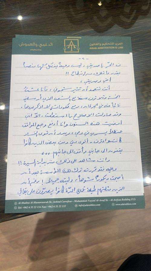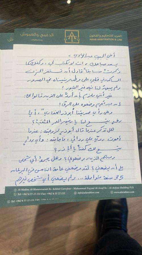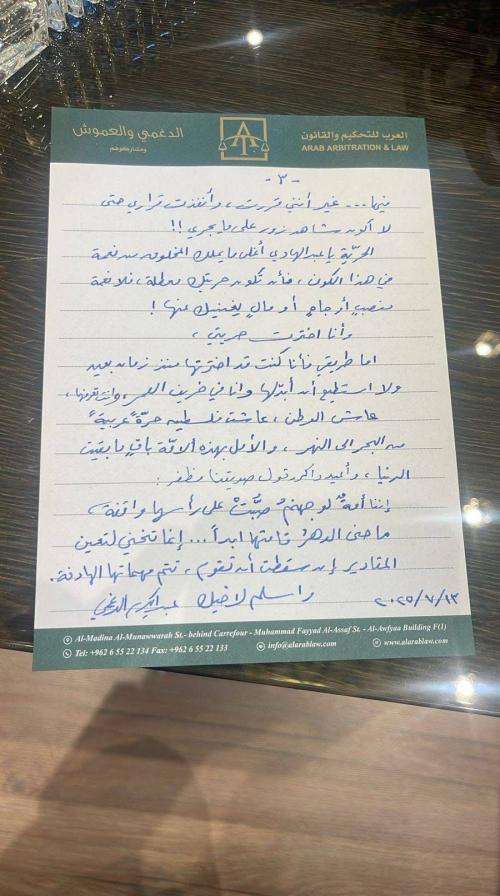 وختم رسالته بتأكيد إيمانه بالوطن والأمة، قائلاً: عاشت فلسطين حرة عربية من البحر إلى النهر، والأمل بهذه الأمة باقٍ ما بقيت الدنيا فنحن أمة إن سقطت تنهض لتتم مهامها.