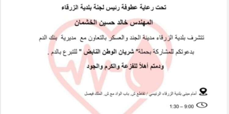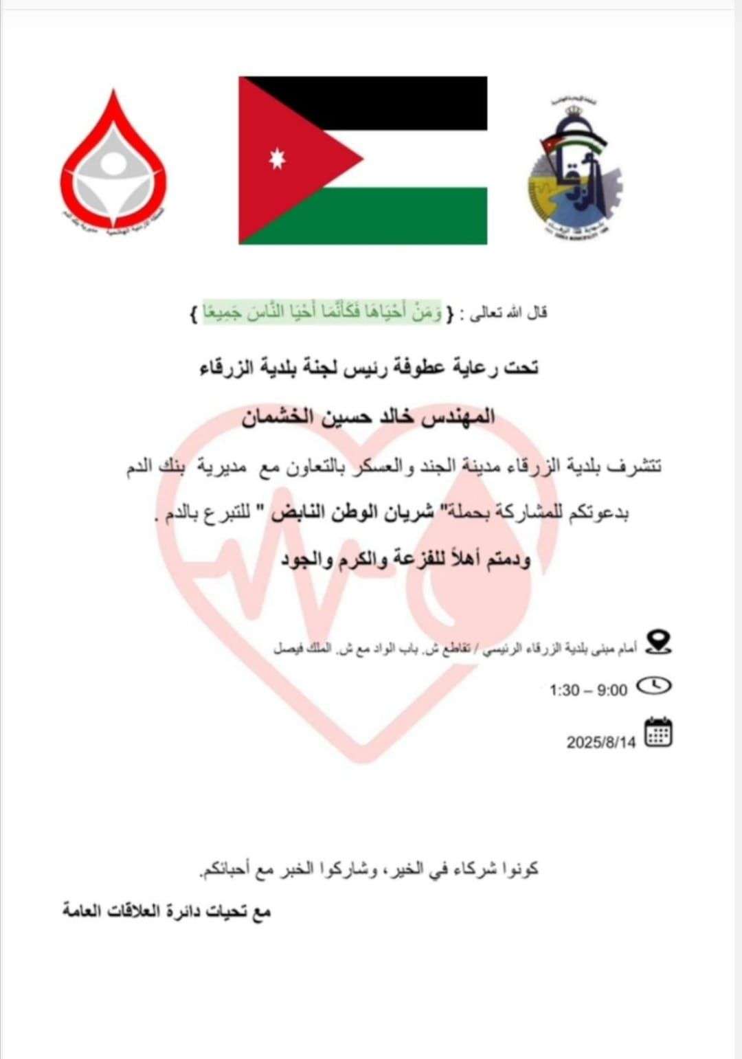 ودعا الخشمان جميع أبناء الزرقاء من جنود وعمال ومواطنين للمشاركة في الحملة، مؤكدًا أن “قطرة دم قد تصنع حياة، والمشاركة واجب وطني يترجمه العمل قبل القول”