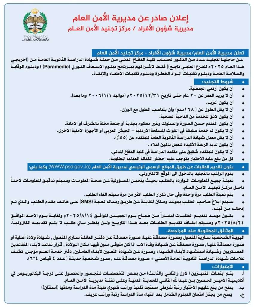 صدى الشعب – تعلن مديرية الأمن العام / مديرية شؤون الأفراد – مركز تجنيد الأمن العام- عن حاجتها لتجنيد عدد من الذكور لحساب كلية الدفاع المدني، من حملة شهادة الدراسة الثانوية العامة، من خريجي هذا العام ٢٠٢٥م للفرع العلمي ناجح فقط، لإشراكهم  بالبرامج التالية: