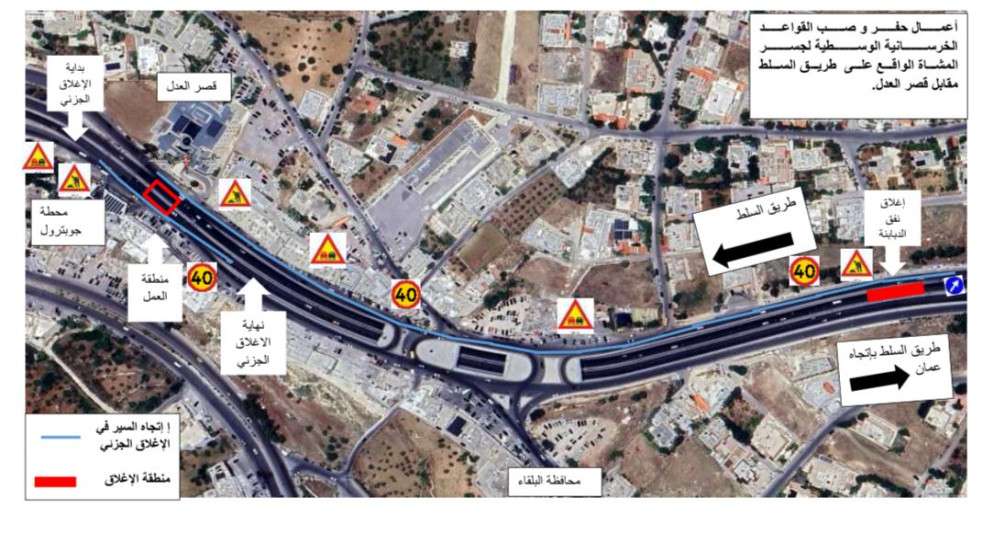 صدى الشعب – أعلنت وزارة الأشغال العامة والإسكان عن تنفيذ تحويلات مرورية مؤقتة وجزئية على طريق عمّان –السلط مقابل قصر العدل في محافظة البلقاء، وذلك ضمن أعمال الحفريات وصب القواعد الخرسانية في الجزيرة الوسطية.