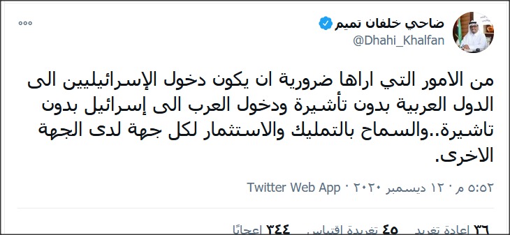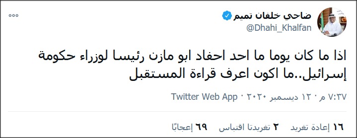 وفي تغريدة أخرى دعا خلفان إلى ضرورة السماح بتملك الإسرائيليين في الدول العربية، وكذلك تملك العرب في “إسرائيل”، متوقعاً أن تكون الأخيرة بعد 50 عاماً ذات أغلبية عربية.
